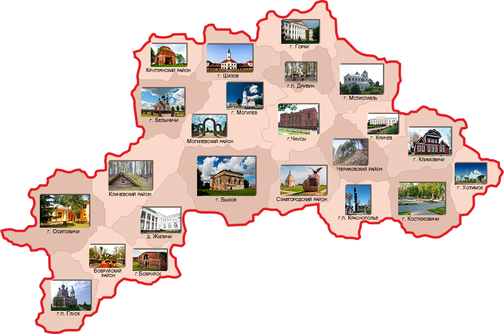 - 21 район (Белыничский, Бобруйский, Быховский, Глусский, Горецкий, Дрибинский, Кировский, Климовичский, Кличевский, Костюковичский, Краснопольский, Кричевский, Круглянский, Могилевский, Мстиславский, Осиповичский, Славгородский, Хотимский, Чаусский, Чериковский, Шкловский) и 2 района в городе Могилеве;